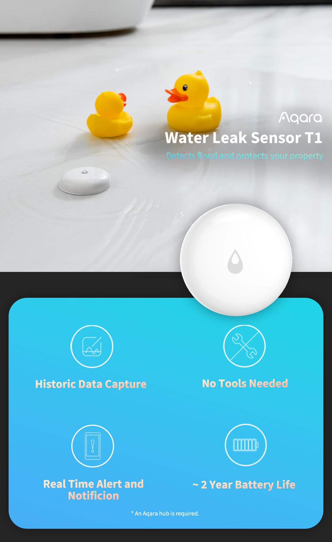 Aqara Water Leak Sensor е сигурен паметен сензор за детекција на вода и протекување, наменет за заштита од поплави во кујни, бањи, подруми или простории со инсталации.